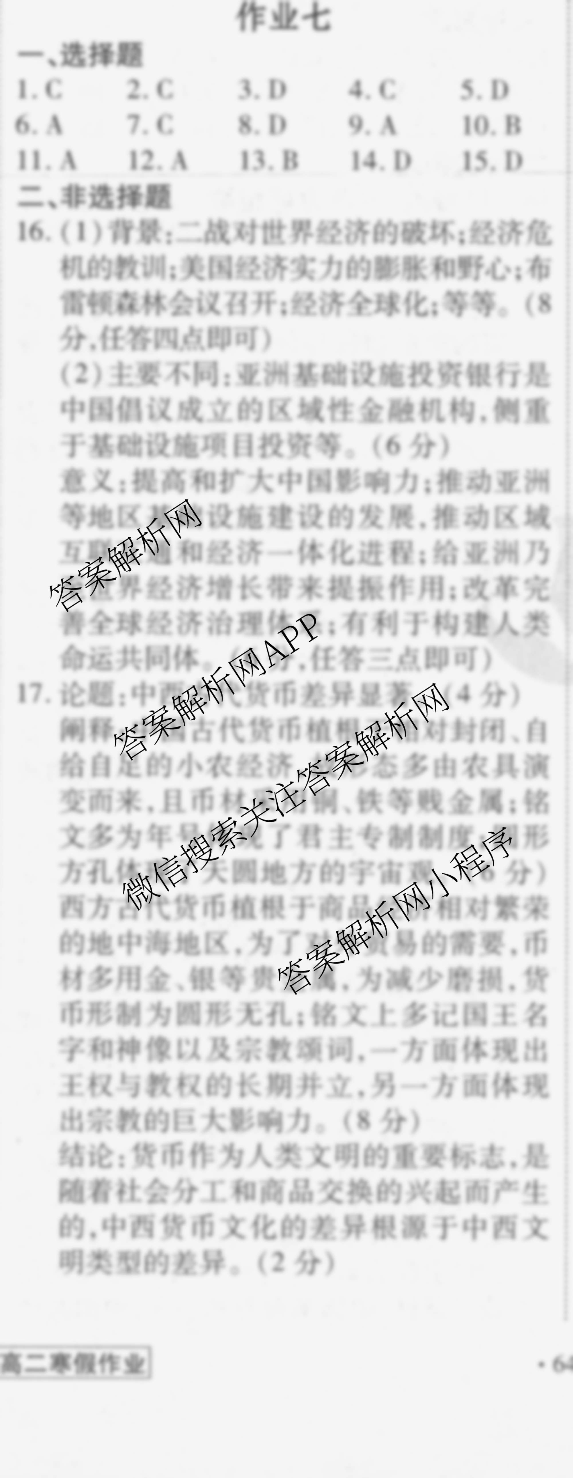 衡水金卷先享题2024-2025学年度高二寒假作业 历史 作业七答案