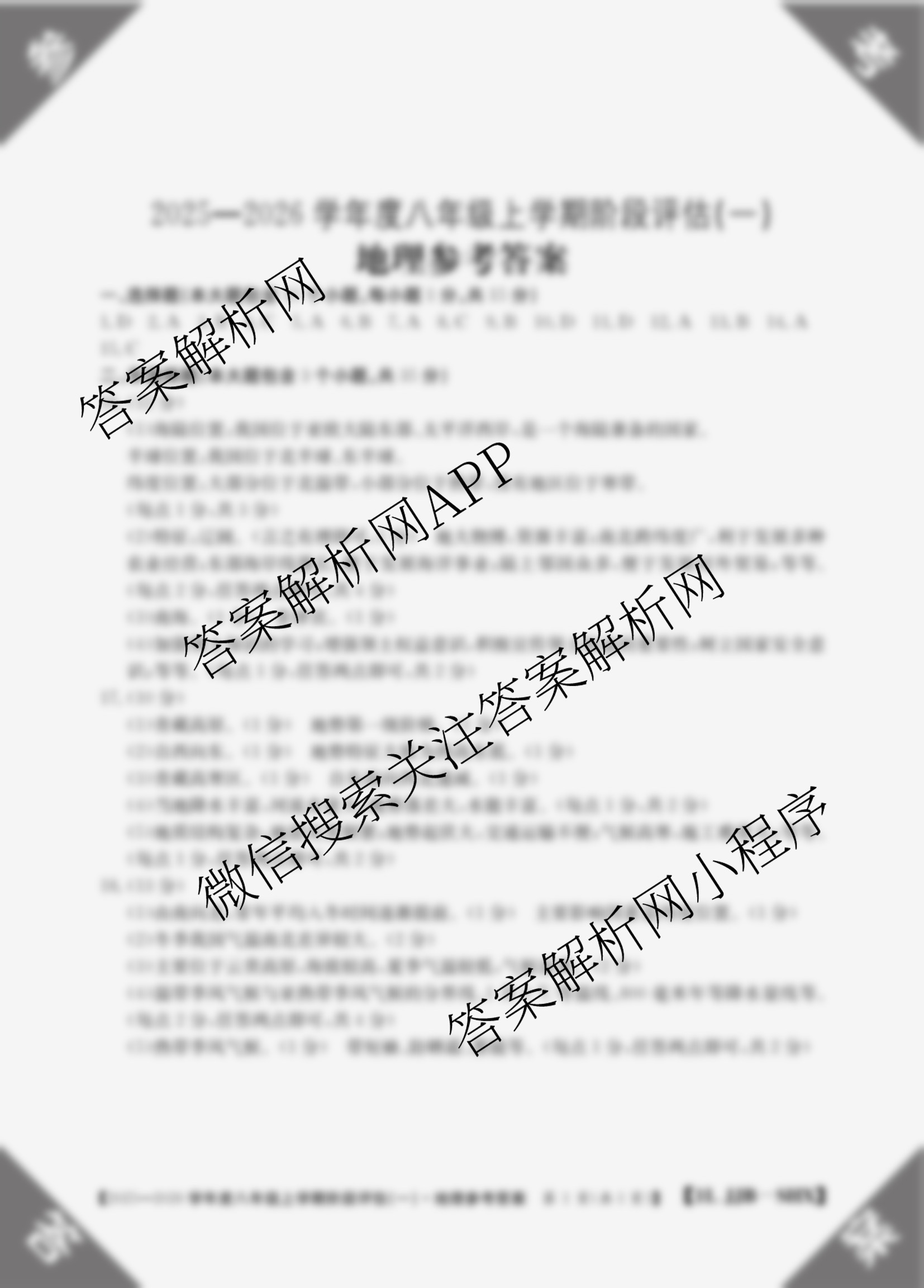 - 2025~2026八年级山西省学年度上学期阶段评估(一)[1L-SHX]地理(XJB)答案