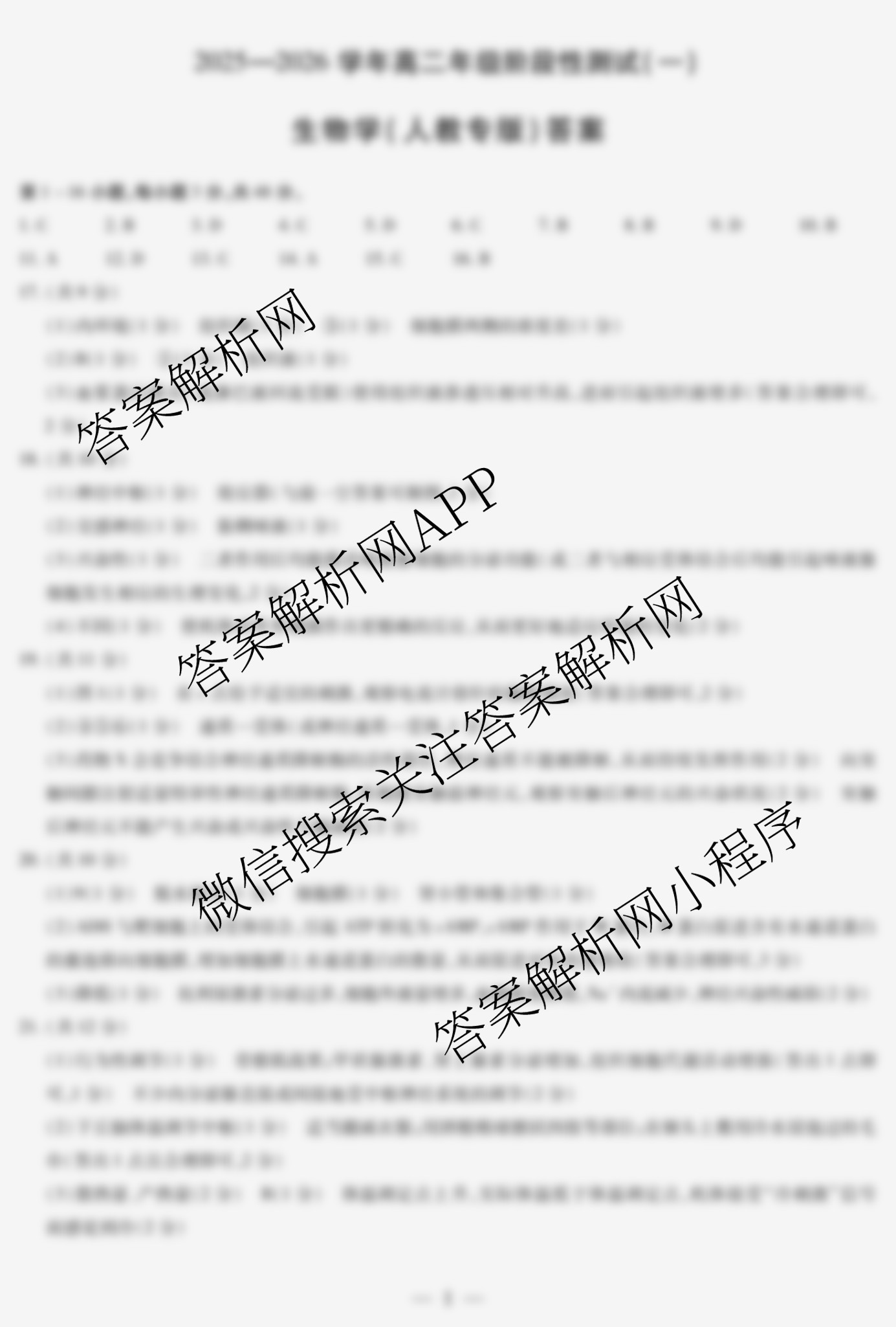 - 2025-2026(高二)[天一大联考]·学年年级阶段性测试(一)生物(人教专版)答案